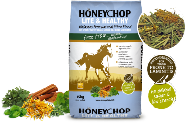 Honeychop Lite & Healthy, free from molasses, is a non-heating low sugar fibre feed suitable for those prone to laminitis. It is coated with linseed and rapeseed oil, including oat straw, timothy grass, herbs, marigolds and cinnamon. 15kg