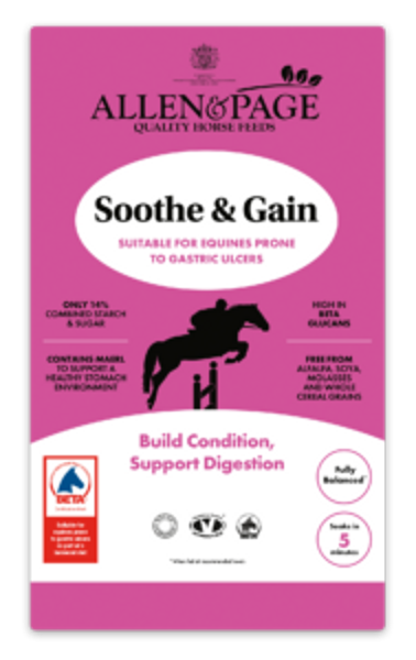 Soothe & Gain is a high calorie, low starch and low sugar soaked feed, suitable for horses and ponies prone to gastric ulcers as part of a balanced diet. 15kg