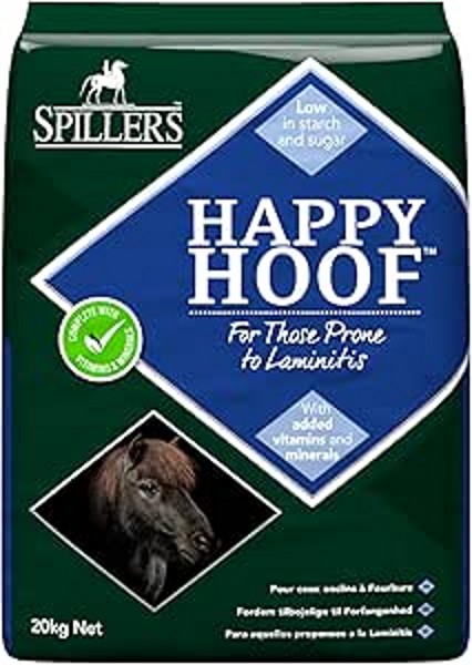 Spillers Happy Hoof is the first and only complete chopped fibre approved by the Laminitis Trust.Mint, garlic and soya oil are added to the quality ingredients to make this feed highly palatable – with added biotin to aid healthy hoof growth.Spillers Happy Hoof contains very low levels of cereal starch and sugar and is high in minerals and vitamins making it ideally suited for horses and ponies prone to laminitis.Low in calories making it ideal for good doers, native ponies and those at rest or in light work.Contains a special blend of natural fibres to help keep your horse or pony eating for longer when compared to cubes and mixes.Spillers Happy Hoof can be fed as a complete feed or a replacement for compound feed. 20kg