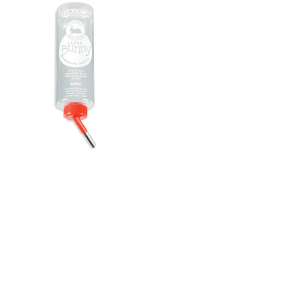 The De-Luxe Large Bunny Water Bottle is made from a high strength recyclable plastic with gnaw resistant angled cap and stainless steel twin ball point sleeves to prevent leakage.High Strength Crystal Clear BottlesStainless Steel Twin Ball Point SleevesGnaw Resistant Angled CapDoes Not LeakWith Wire Cage AttachmentThe Large 600ml bottle is suitable for rabbits, guinea pigs, parrots, pigeons and other small animals. 600ml