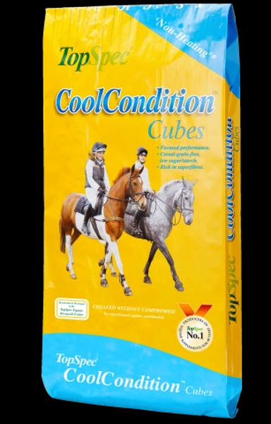 TopSpec CoolCondition Cubes are ideal in those circumstances where extra condition is required without ‘fizz’.CoolCondition Cubes are cereal-grain-free, low in sugar and starch, and ‘Non-Heating’. At the same time they have a good conditioning index of 12.5MJ/kg, equivalent to most cereal-containing conditioning compound feeds. 20kg